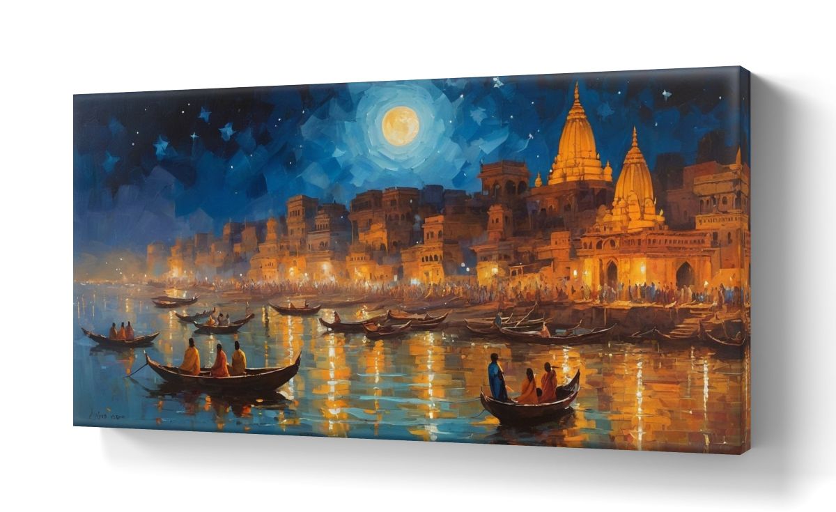 Bring the spiritual essence of India’s oldest living city into your home with this stunning Banaras Ghat canvas painting. This masterpiece captures the soul-stirring beauty of the Ganges at twilight, where the celestial glow of a full moon meets the warm, golden radiance of temple lamps.