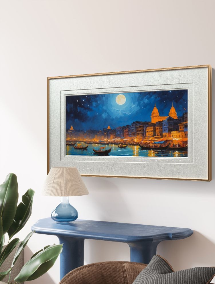 Bring the timeless soul of India into your home with this exquisite Varanasi Ghat painting. Captured under the ethereal glow of a full moon, this artwork depicts the silhouettes of the boats rocking on sacred Ganga riverfront of Banaras in a stunning display of vibrant blues and warm, golden embers.