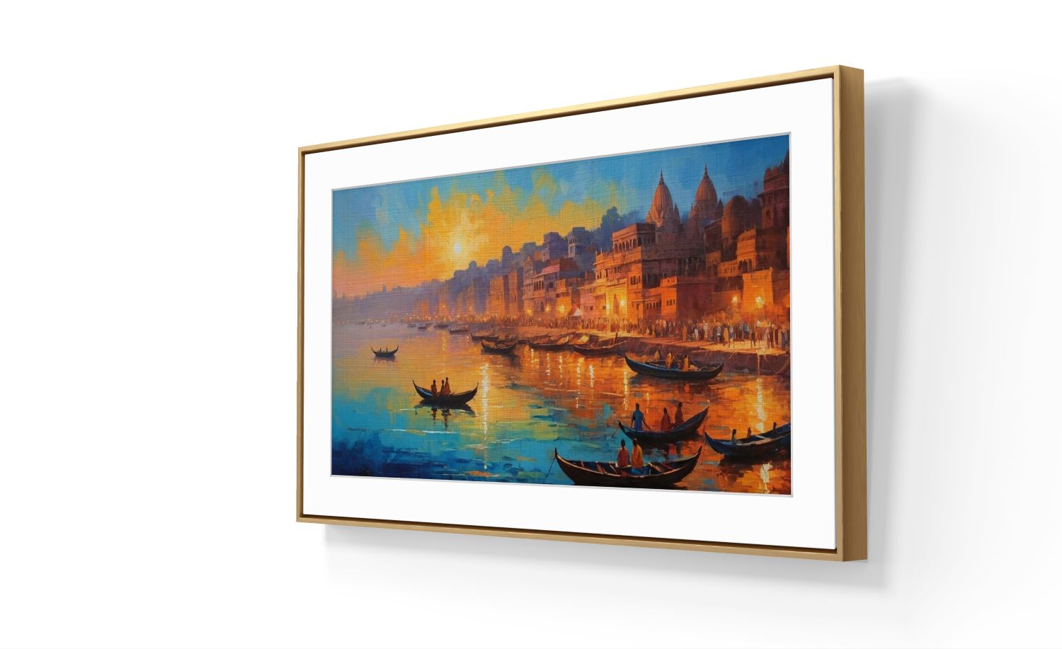Bring the spiritual essence of India’s oldest living city into your home with this breathtaking Varanasi painting. This premium canvas art print captures the ethereal beauty of the Ganga Ghats at the golden hour, where the setting sun bathes the ancient stone temple architecture in a warm, divine glow.