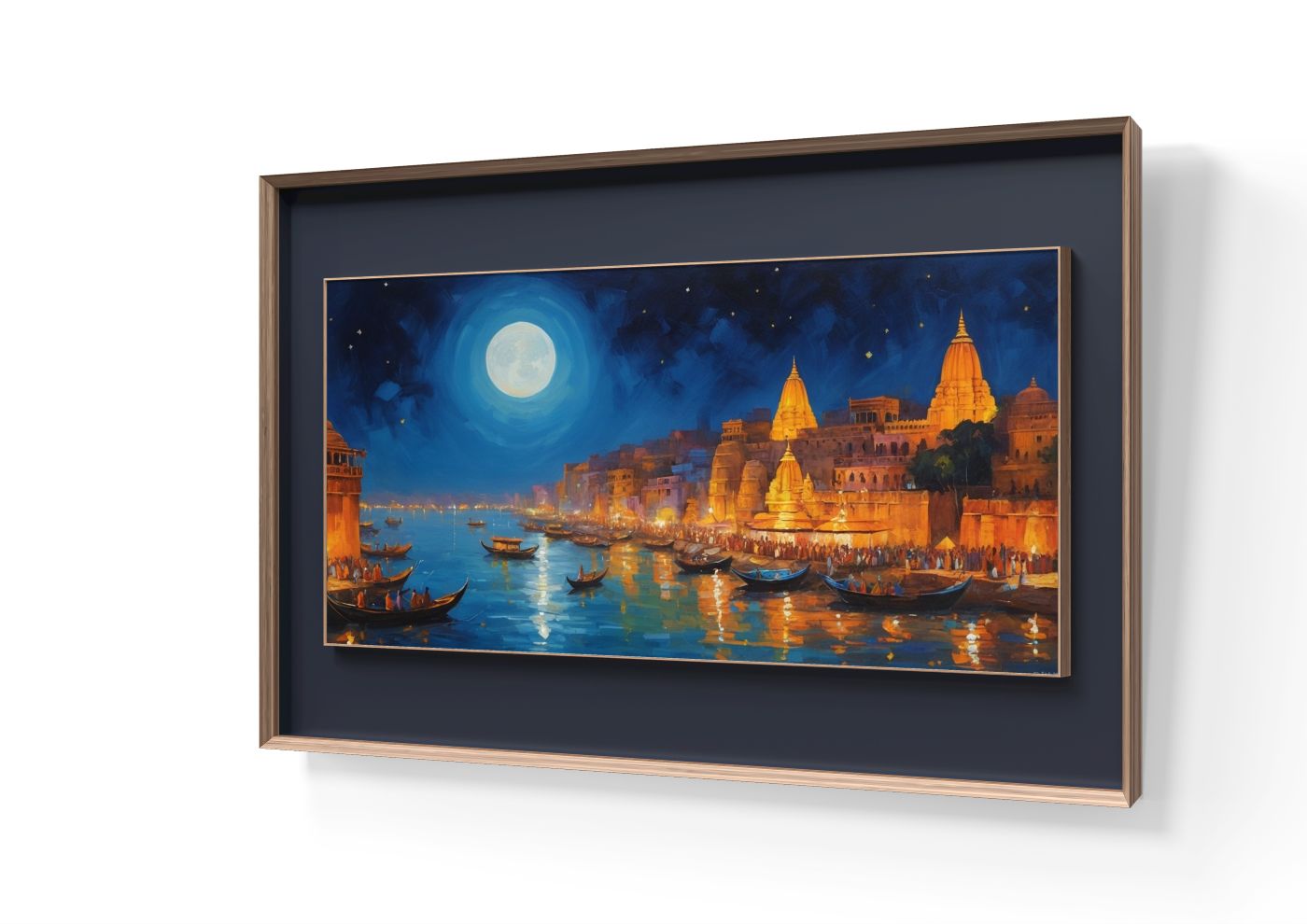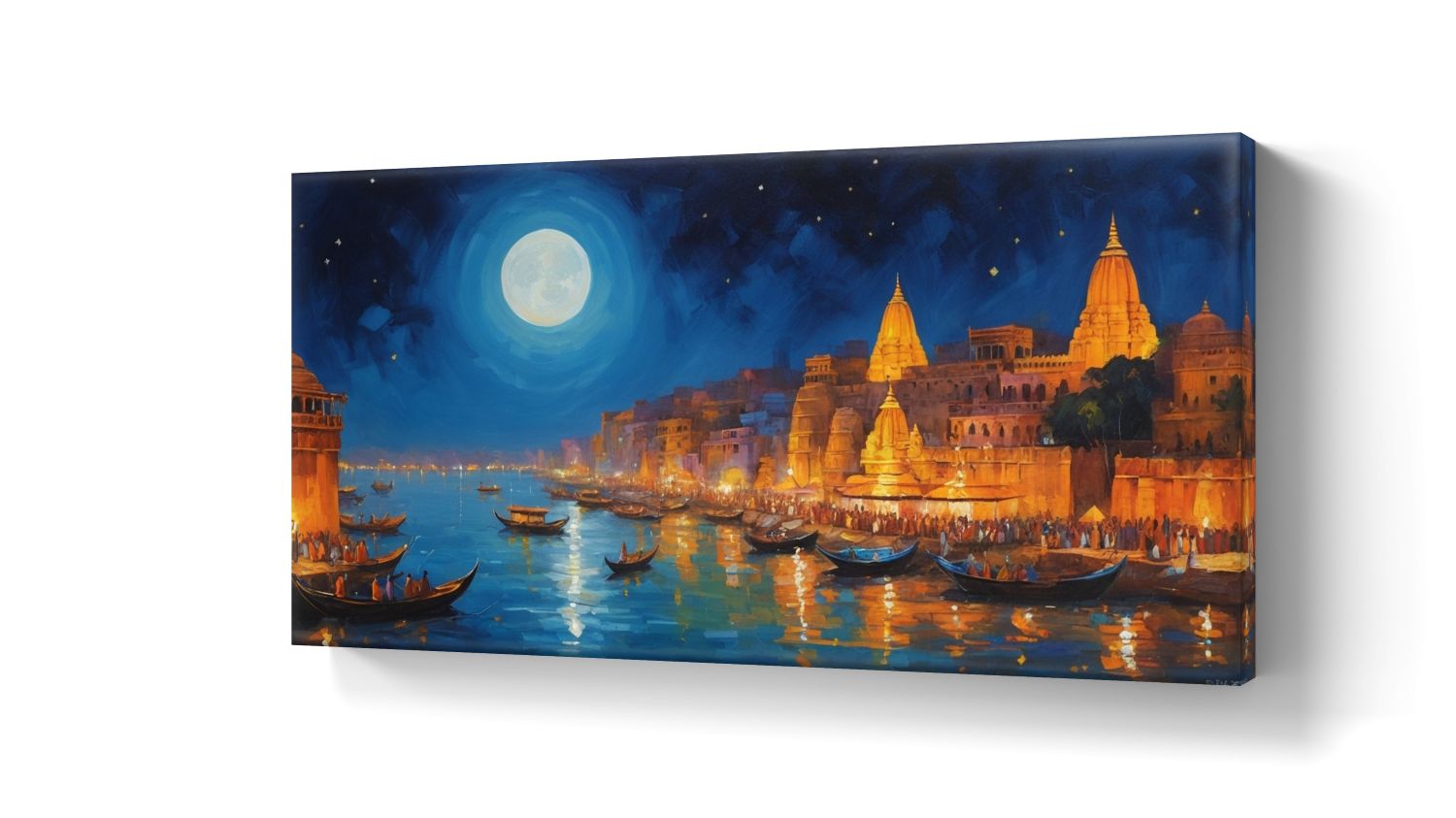Experience the spiritual essence of India’s oldest city with this breathtaking Kashi ghat painting. Captured under the ethereal glow of a full moon, this art piece brings the timeless serenity of the Ganges directly into your home.