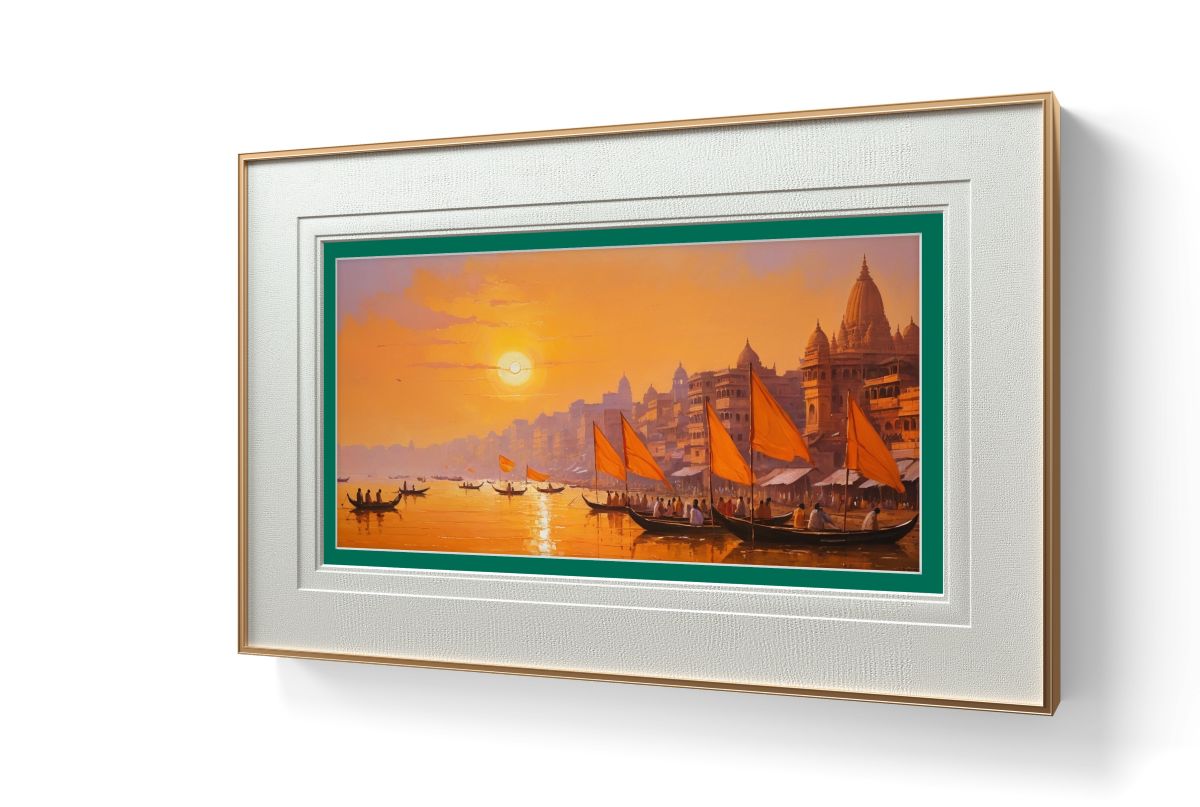 Bring the timeless spiritual energy of the Ganges into your home with this breathtaking Varanasi ghat painting. Capturing the ethereal "golden hour," this piece depicts the sun’s glow reflecting off the sacred waters, illuminating ancient temples and traditional boats in a warm, soul-stirring palette of amber and gold.
