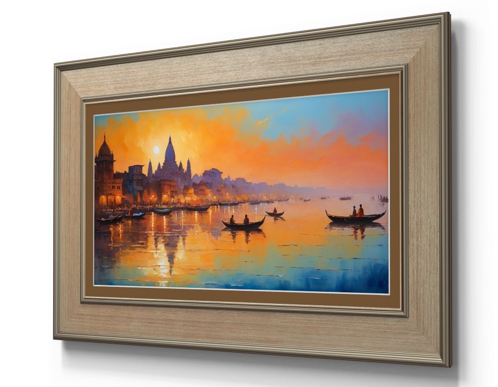 Bring the timeless energy of India’s spiritual capital, Kashi, into your home with this breathtaking masterpiece capturing the ethereal 'golden hour' before sunrise on Varanasi. This stunning Varanasi Ghat painting depicts a serene dawn where the golden light of early morning kisses the ancient temple spires and reflects beautifully across the sacred Ganges, immersing you in the fiery hues of a waking sky.